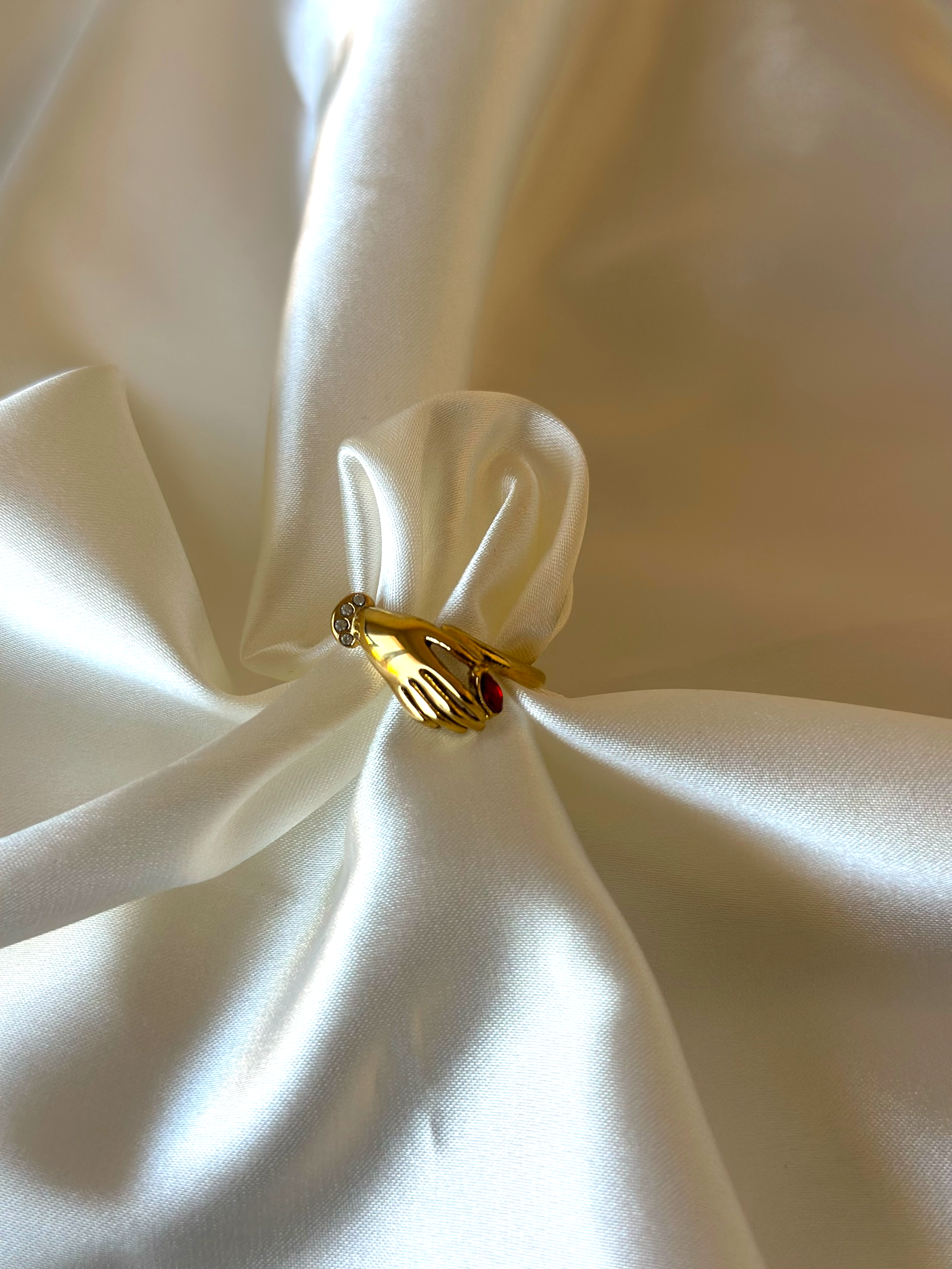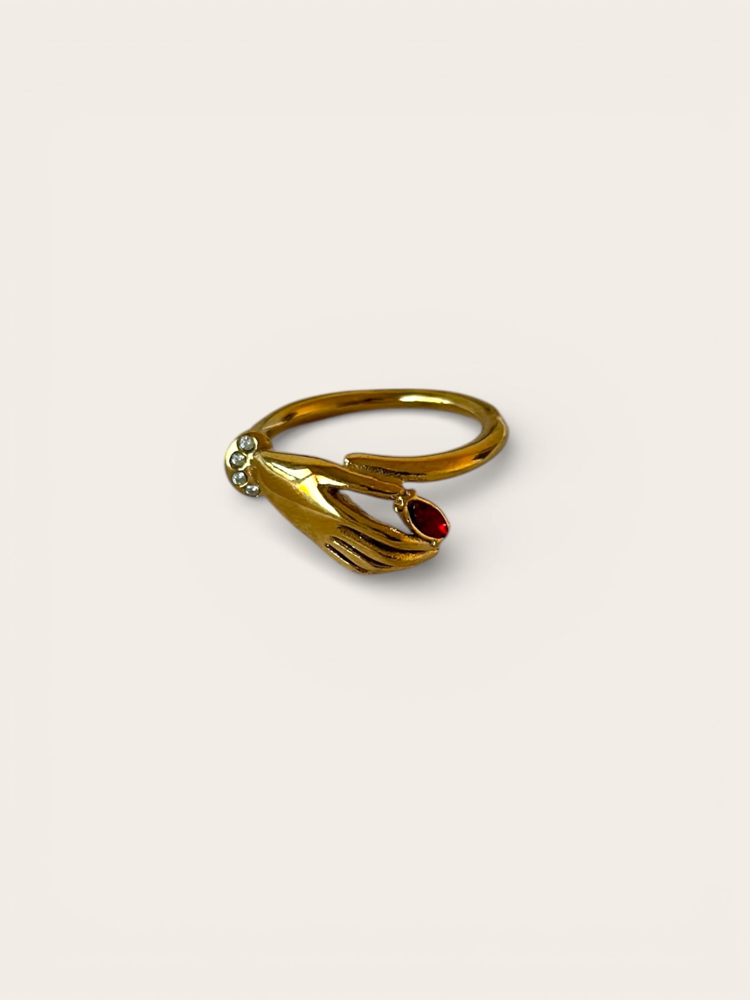 Anello in acciaio inossidabile con pietra rossa e zirconcini bianchi con forma di una mano