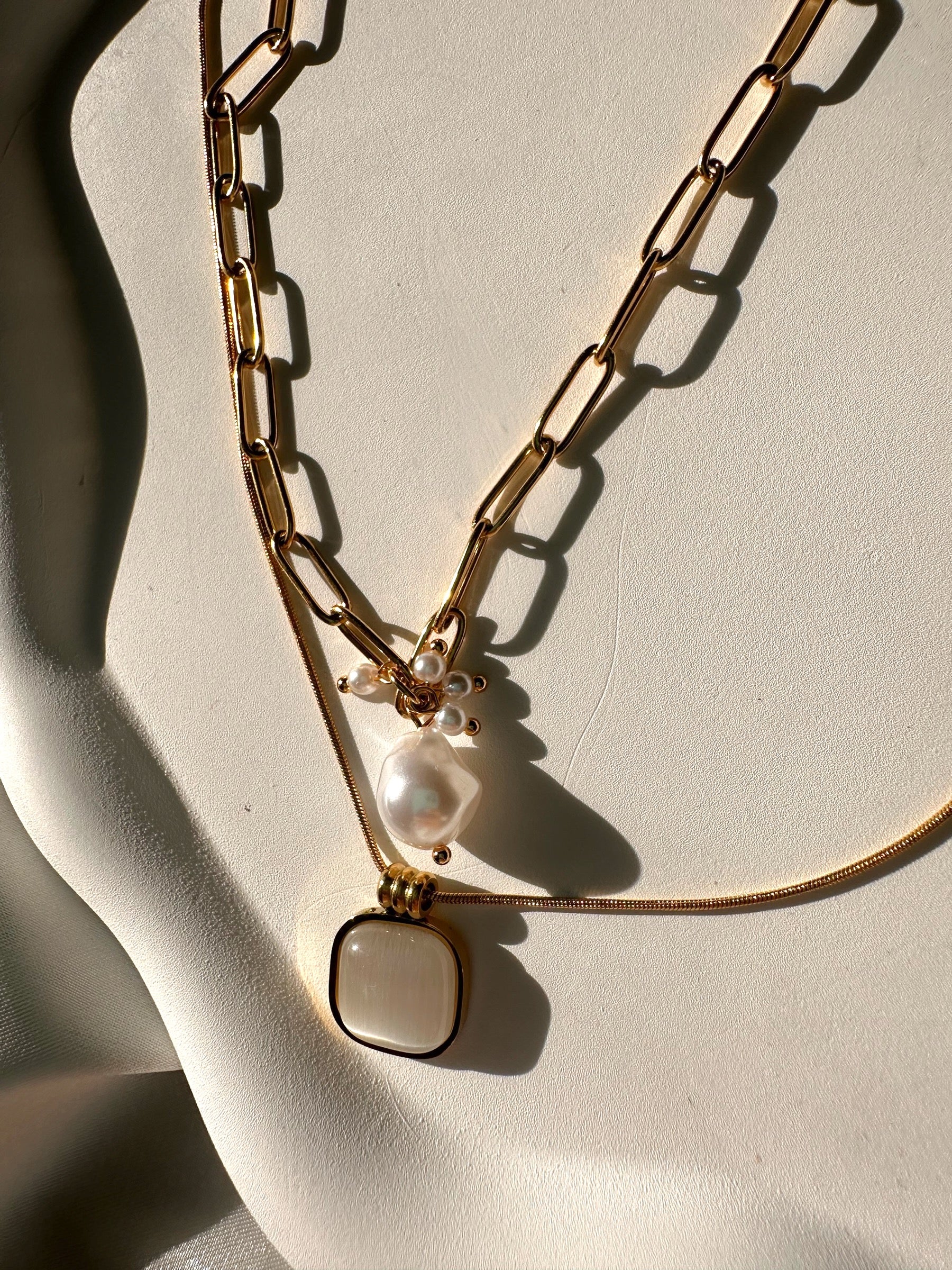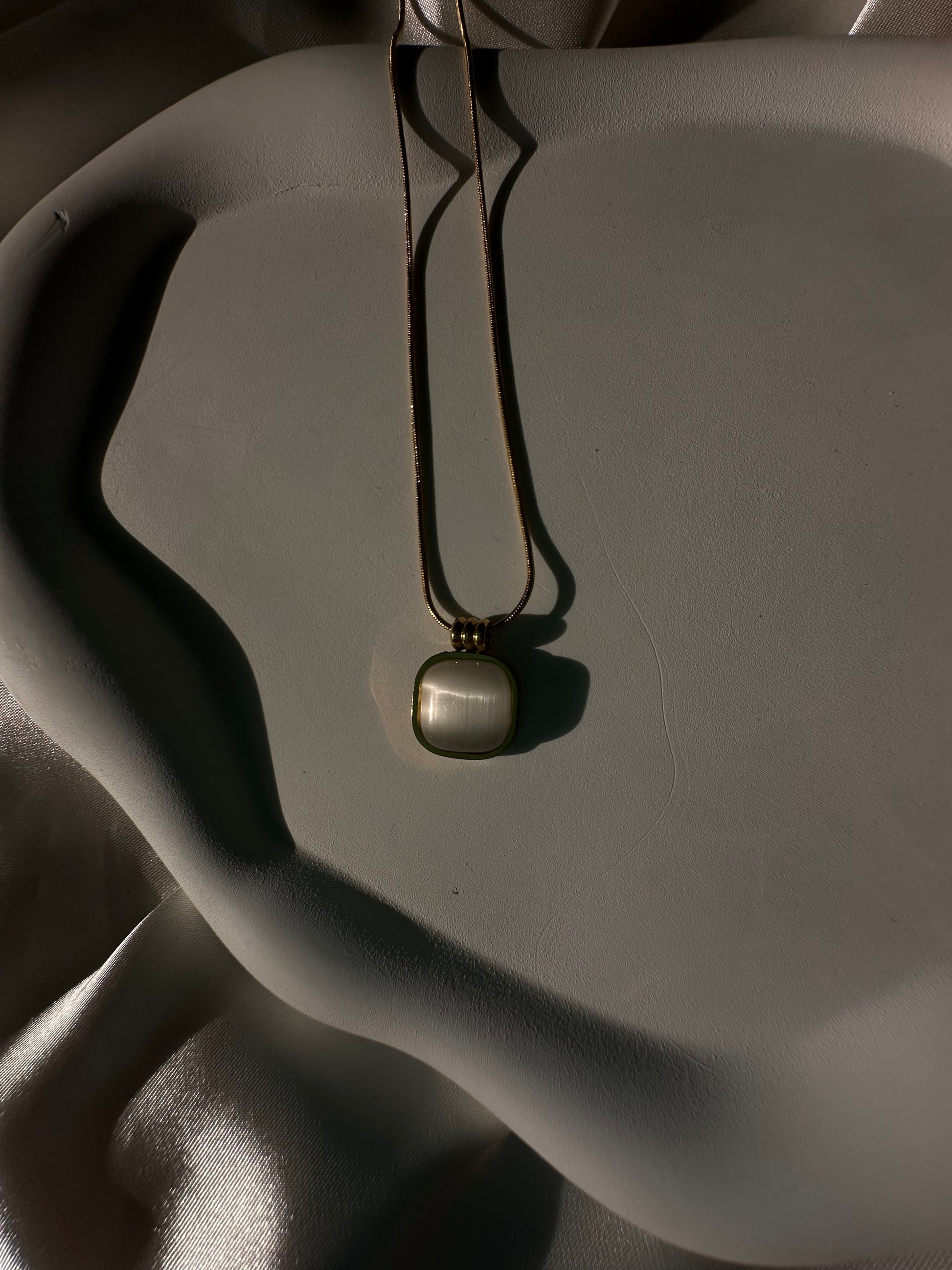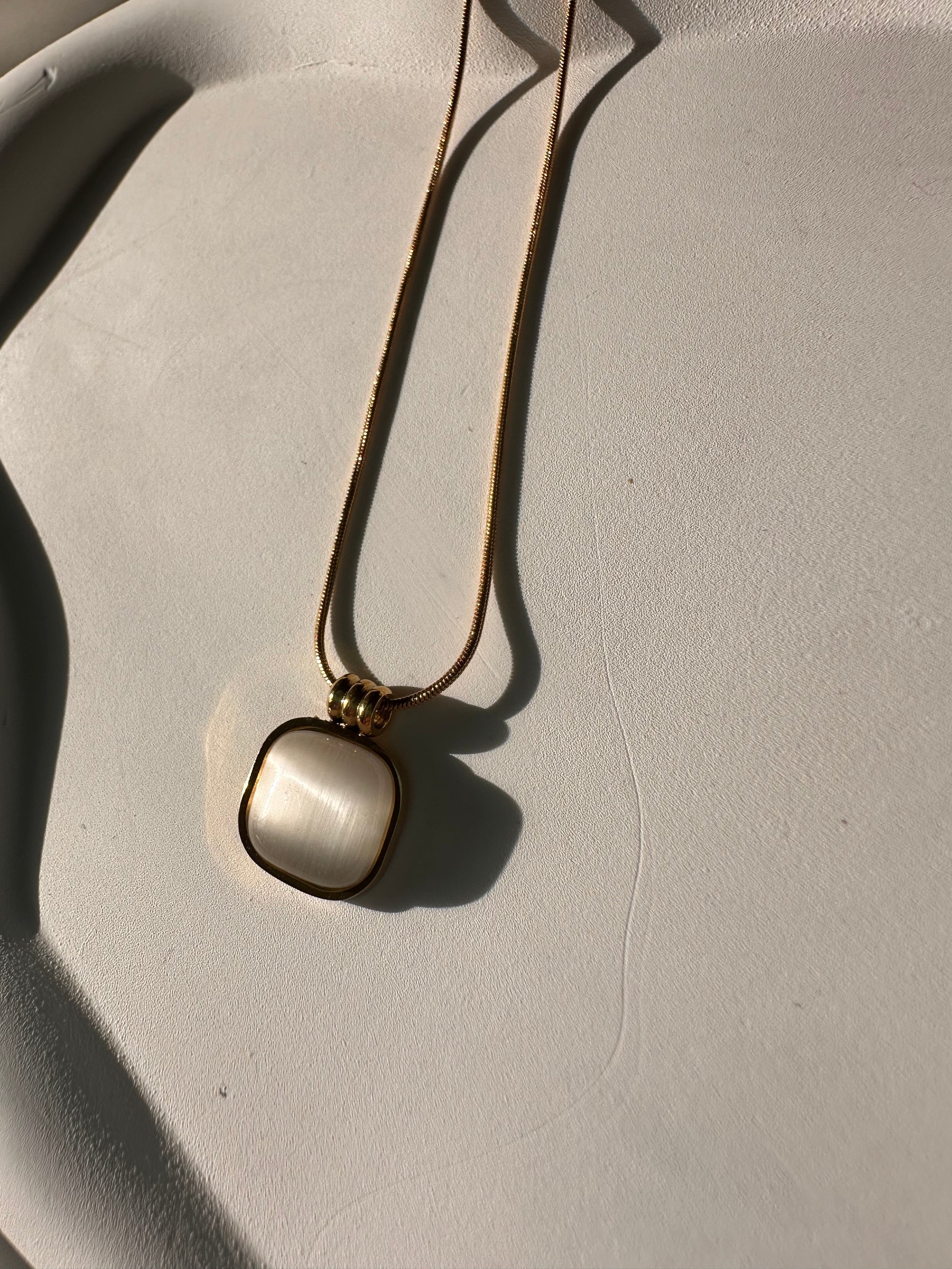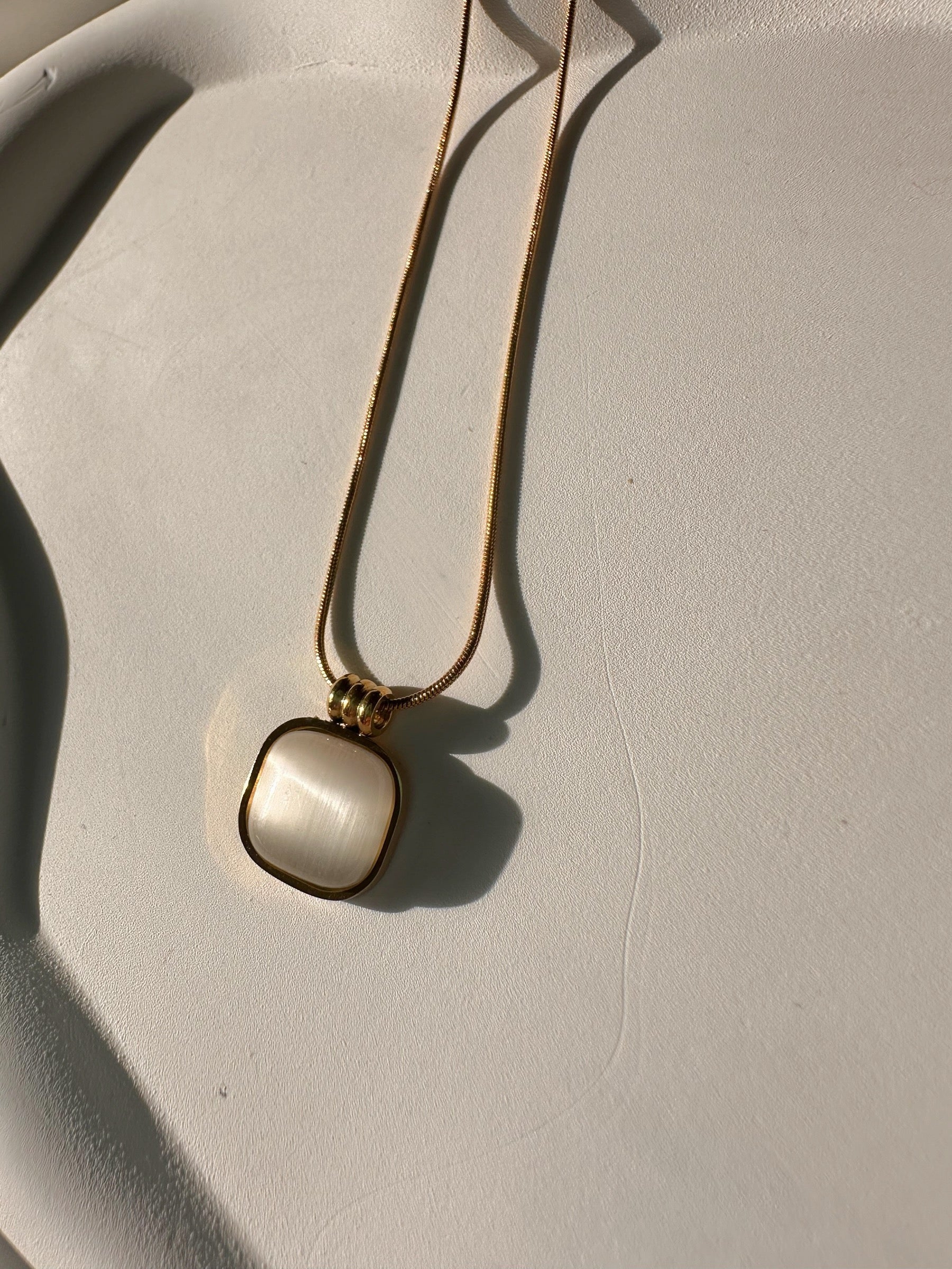 Collana in acciaio inossidabile regolabile con pendente quadrato in pietra beige.