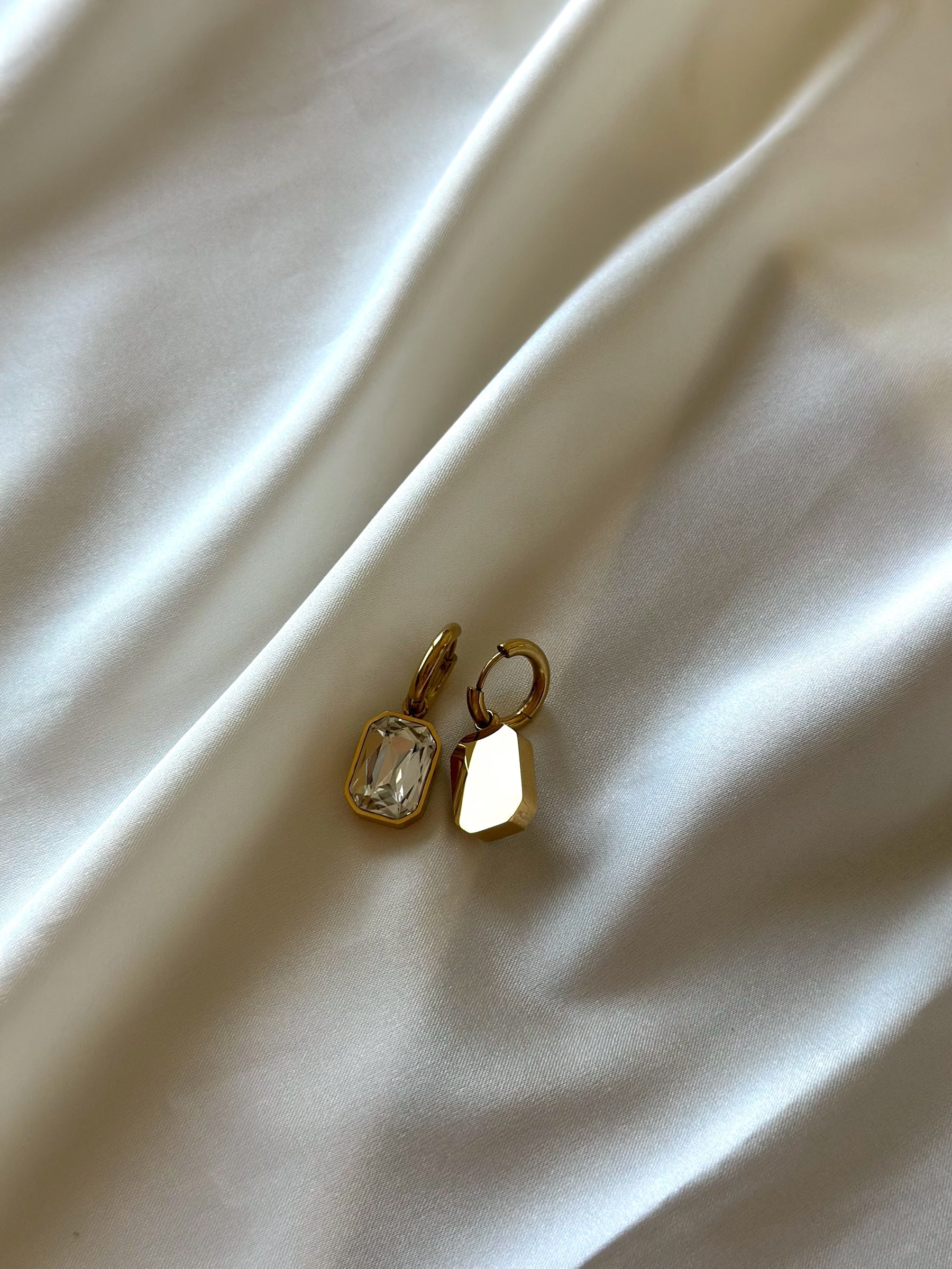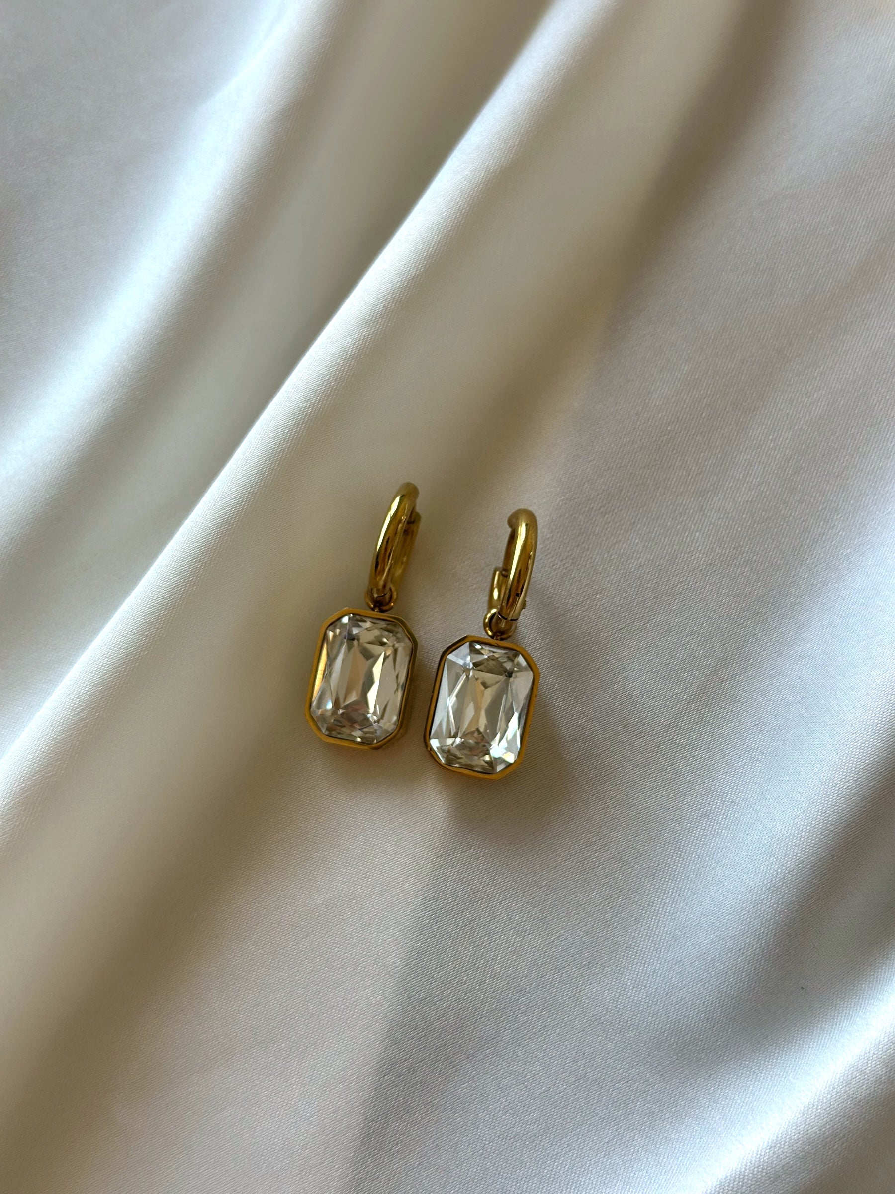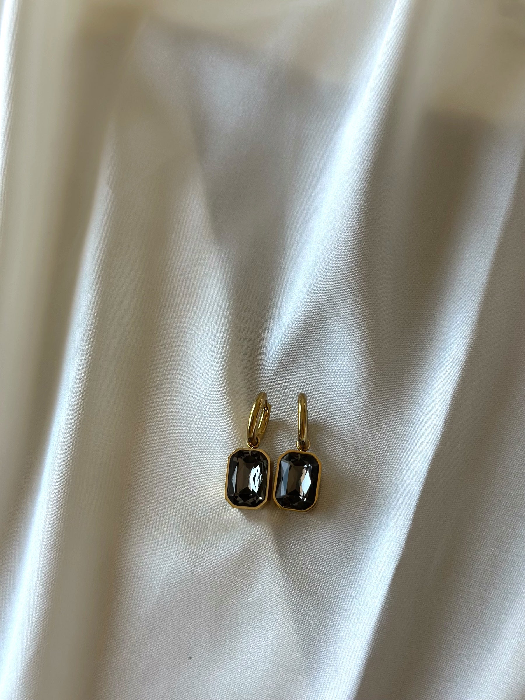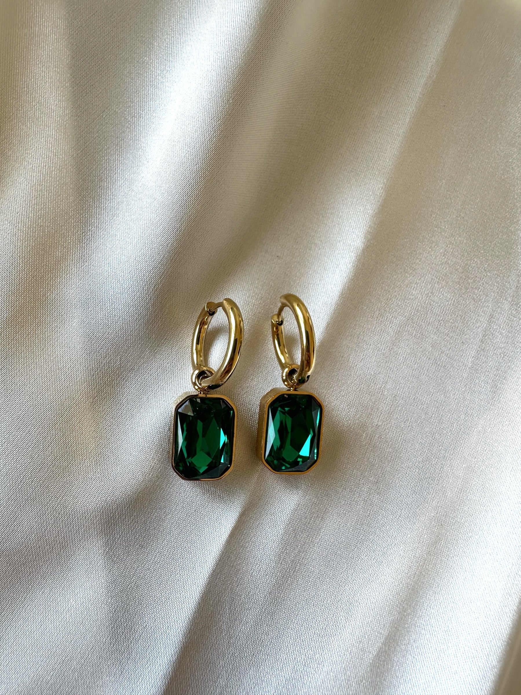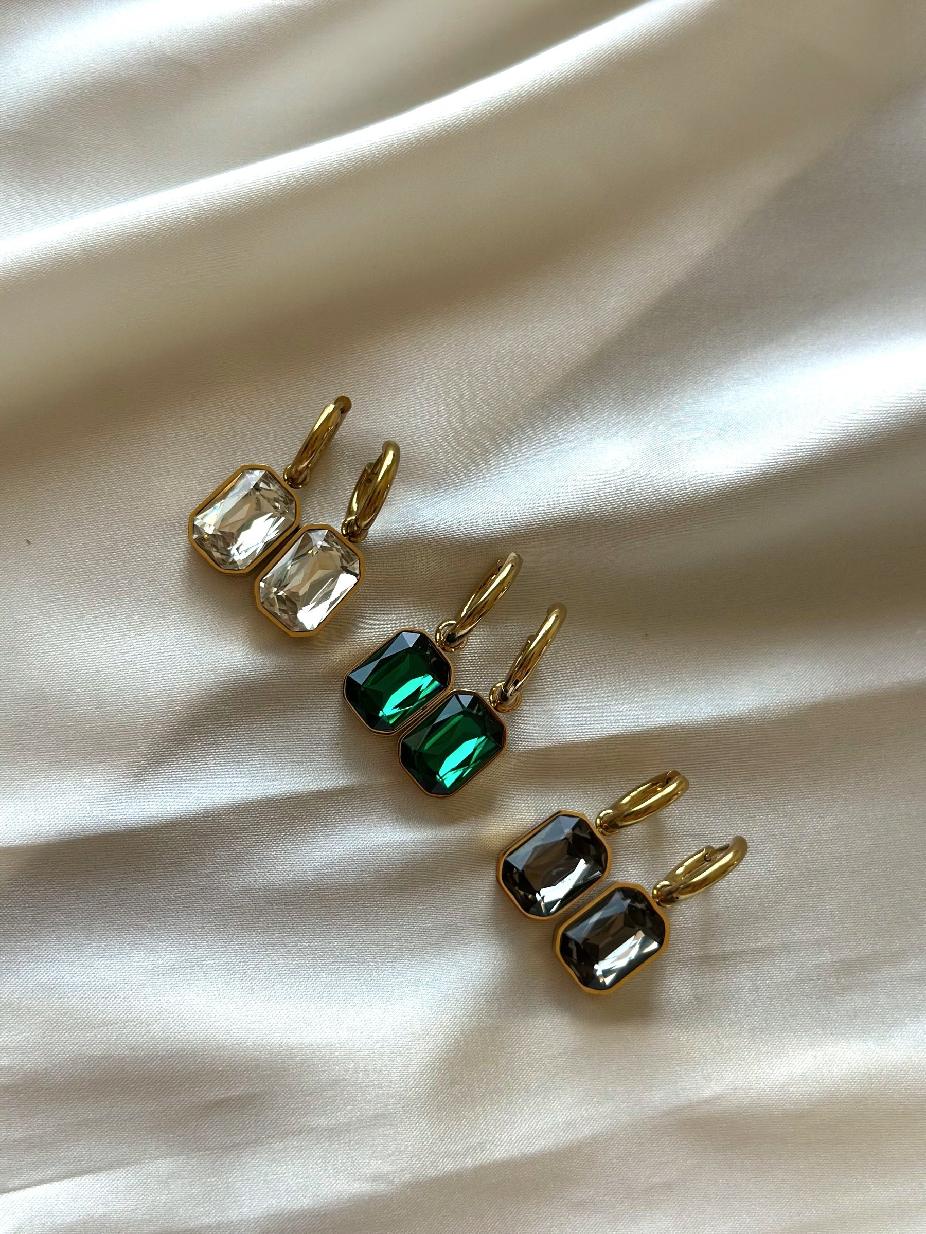 Orecchini a cerchio in acciaio inossidabile con pendente super luminoso con pietra colorata bianca, verde o nera. Dimensione cerchio 2,5x15 mm ; Dimensione pendente 11,7x15,6 mm